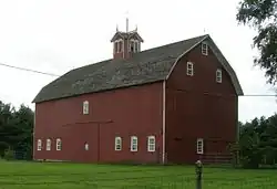 The barn is a gambrel-roofed frame building. The barn is 80 feet (24 m) long by 40 feet (12 m) and 44 feet (13 m) high. The eaves are 27 feet (8.2 m) above the ground. A cupola is centered on the roof. The exterior of the barn was originally red siding with white trim along the roof and down the corners. In the 1950s a white gypsum siding was placed over the original wood siding. The foundation is built of cut stone hauled from Joliet Prison in Joliet, Illinois.[3] There are two large sliding doors located in the middle of the north and south walls. These doors have been altered from their original position and several small doors have been added.[3] All the windows are original. Each is a pedimented, double-hung sash windows with six over six lights. Fourteen are on the lower half of the barn (North 6, East 1, South 6, West 1) with the remaining 8 higher on the walls.[3] A number of fixed sash windows were added in the 1950s,[3] but have been removed by the summer of 2014.[4] The gambrel roof is covered with cedar shake shingles.[3] The cupola has shuttered windows all four directions with four gables. A metal trim tops each gable.[4]