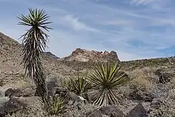The plant community vegetation types here are predominantly Creosote bush (Larrea tridentata) xeric desert scrub and desert wash scrub habitats. In the spring, the alluvial fans turn yellow with Brittlebush - Encelia farinosa and other desert wildflowers.[1]