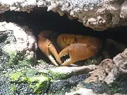 The only land animals known to exist are two species of reptiles (the Pacific stump-toed gecko and the copper-tailed skink),[72][73] bright-orange land crabs known as Clipperton crabs (Johngarthia oceanica, prior to 2019 classified as Johngartia planata),[74][75][76] birds, and ship rats. The rats probably arrived when large fishing boats wrecked on the island in 1999 and 2000.[77]