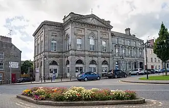 St Tighearnach's Church of Ireland is a limestone, cruciform Gothic revival Church of Ireland church. A sketch dating to 1586-7 shows evidence of churches being present on the site from before the land was leased to Sir Henry Duke by the English crown.[15] The earliest inscription on St Tighearnach's Church reads: 1696.[15] The actual Church of Ireland Parish itself predates this. The earliest recorded Rector of Clones was James Hygate, a native of Scotland, who was appointed in 1609.[15] The 17th century structure was replaced in 1822–25 by a building designed by John Bowden, Board of First Fruits diocesan architect, or his successor William Farrell. It was remodeled in 1857–8 to become a pro-cathedral. It features a steep set of fourteen sandstone steps, a three staged tower with ashlar masonry and a crenellated parapet topped with a spire with pointed-arch windows with chamfered surrounds and hood mouldings.[23]