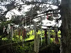A clootie well is a holy well (or sacred spring), almost always with a tree growing beside it, where small strips of cloth or ribbons are left as part of a healing ritual, usually by tying them to branches of the tree (called a clootie tree or rag tree). Clootie wells are places of pilgrimage usually found in Celtic areas. It is believed that the tradition comes from the ancient custom of leaving votive offerings in water.[1] In Scots, a clootie or cloot is a strip of cloth or rag.