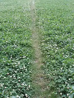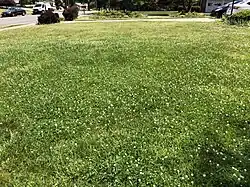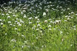 A clover lawn is composed of clover and can be used as an alternative to grass lawns. It requires less maintenance than a traditional lawn, uses less water,[1][2] is more heat-tolerant,[3] and fixes its own nitrogen using symbiotic bacteria in its root nodules, removing the need to fertilize. It is less robust to foot traffic than grass, and can stain clothes if bruised. Clover can be oversown on grass if some grass in the lawn is acceptable. If the variety chosen does not self-seed efficiently in place, it may need resowing every few years.[4] If grown continually, it may be susceptible to clover sickness.