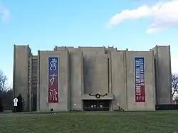 Clowes (/klz/) Memorial Hall, which opened in 1963, was co-designed by noted Indianapolis architect Evans Woollen III, of Woollen, Molzan and Partners, and John M. Johansen, a well-known architect who established his practice in New Canaan, Connecticut. The performing hall is notable for its exposed concrete slabs, which are typical of the Brutalist architecture style.[2] Woollen served as the junior partner in the project but was the "driving force behind its design and detail."[3] Since it opened, the architectural community has praised its bold design.[3] In 2021, a six-person panel of American Institute of Architects (AIA) Indianapolis members identified the venue among the ten most "architecturally significant" buildings completed in the city since World War II.[4]
