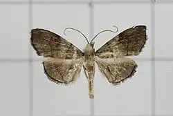 The wingspan is 21–26 mm.[4] The wings are fuscous cinereous (ash gray) with a slight purplish gloss. The transverse lines are dark brown.[5]