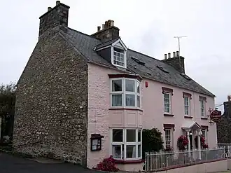 It is set in a Grade II listed pink painted Georgian townhouse named Ivy House,[3][4] in a small seaside town,[5] and takes its name from the medieval Celtic sport of Cnapan, although there is little to connect the two today.[6] Dated to the early 19th century, architecturally Ivy House, two-storeys with attic, is described as "painted roughcast, with panelled doorcase and fanlight, the porch with the etiolated, debased classical columns popular all over the region".[7] There are three bays on each floor at the front, with a French window on each floor on the western wing, where the restaurant is located. Next door is Sessions House, dated to 1900, but with a stucco front with windows in the late 18th-century style.[7] As of 2001 it had five double rooms, a bar, and a restaurant; it is the restaurant for which it has earned its reputation.[1][8] The interior consists of traditional Welsh oak furnishings.[9] In the hallway is a traditional heavy oak Welsh dresser which contains items belonging to the owners. In the sitting room is a wood-burning stove and books and magazines, and in the dining room is a large stone fireplace, with pictures and pieces of armour on the walls and lace-covered tables. The bedrooms are small, with pine furniture and bright hues, with a "tiny shower".[8] The hotel has been run by the Coopers since 1984; Judith Cooper and her daughter are the chief cooks.[8] It became a Grade II listed building on 14 April 1992.[3]