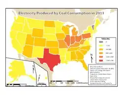 The average share of electricity generated from coal in the US has dropped from 52.8% in 1997 to 19.7% in 2022.[11] In 2017, there were 359 coal-powered units at the electrical utilities across the US, with a total nominal capacity of 256 GW[12] (compared to 1024 units at a nominal 278 GW in 2000).[13] The actual average generated power from coal in 2006 was 227.1 GW (1991 TWh per year),[14] the highest in the world and still slightly ahead of China (1950 TWh per year) at that time. In 2000, the US average production of electricity from coal was 224.3 GW (1966 TWh for the year).[14] In 2006, US electrical generation consumed 1,027 million short tons (932 million metric tons) or 92.3% of the coal mined in the US.[15]