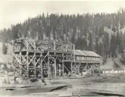 In 1911, the McTavish general store,[39][40] post office,[41] and Presbyterian church were among the many buildings springing up. A 91-metre (300 ft) bridge across the Tulameen[42] was completed[43] at Upper town.[44] Development occurred at both locations.[45] That year, the school was established in a temporary building.[46] Overly optimistic expectations regarding Coalmont's future[47] prompted a series of businesses to propose or build premises.[48] The Tulameen sawmill provided lumber for the company's buildings, bunkhouses, boarding houses, dwellings, and stores.[49] The 4,600-metre (15,000 ft) daily capacity mill was soon moved from Tulameen[50] and installed about 1.6 kilometres (1 mi) above the townsite.[51]