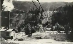 In 1920, the aerial tramway at Boundary Falls was dismantled and transported to Coalmont,[15] where a 4-kilometre (13,110 ft) tramway was installed for connecting the mine site with the Coalmont tipple.[16][17] The power plant also supplied electricity to Coalmont.[18] Unfortunately, the tramway experienced ongoing cable problems.[19] The next year, accommodation was greatly expanded at the mine site.[20] By 1922, the latter place was called Blakeburn.[21] In 1924, stronger more reliable cable was installed on the tramway, which was claimed to be the longest cable in North America, and the longest aerial tramway in the coal mining industry.[22] In 1926, one of the towers supporting the cable partially collapsed.[23] Months later, a forest fire destroyed two towers, resulting in a two-week shutdown of production,[24] because no coal storage facilities existed at the mine site.[25] The next year, a 360-kilogram (800 lb) casting on the tramway broke.[26] In 1928, a snapped cable shut down production for a week.[27] The colliery was the largest and most important coal operation in the Princeton district.[16]