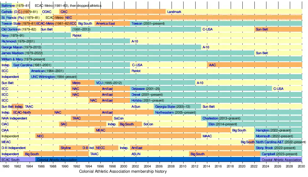 3. ^ Towson joined the league as a charter member in the 1979–80 season, left after the 1980–81 season to join the ECAC-Metro Conference (now known as the Northeast Conference), and rejoined the CAA effective the 2001–02 season.