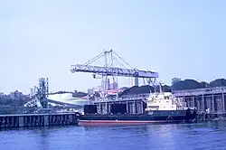 The Carrington coal port used twelve hydraulic cranes powered by water under pressure supplied from a pumphouse nearby.[105] There were also three steam cranes, which had been relocated from Queens Wharf.[60] In 1890, this government-operated facility was capable of loading a total of 12,000 tons per day. The first electric cranes were commissioned at the Basin, in 1916, but at the end of that year needed to be shutdown for a short time, while the power supply was improved. By mid 1917, there were six electric cranes there.[106][107][108]