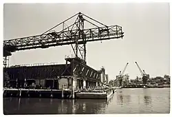 The first wharves on the Basin were those on the eastern side, opposite the wharves of the Dyke.[99] At first, the Basin was used as mooring and as a location to unload ballast. By mid-1903, two—of eventually six—coal loading cranes were operating there,[102] essentially as an extension to the loading operations of the Dyke. In 1913, work was underway on another line of wharves, on the western side of the Basin.[103] Those new wharves were completed in 1915.[104]