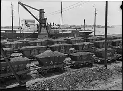 There was a colliery at Stockton, the Stockton Colliery. Coal, exclusively from that mine, was loaded on the Hunter River side of the Stockton peninsula, from 1885 to 1908. Coal was carried a short distance from the mine, in railway wagons, onto an elevated structure and dumped, via a staith, into the ship's hold. Later, two steam cranes were relocated from Queens Wharf at Newcastle.[41][84][85] It was the only significant ship-loading operation on the left bank (northern side) of the Hunter River estuary.