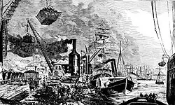 The Dyke had the effect of constraining the main channel of the Hunter River, so that the natural flow and tidal movement of the river tended to scour sediments from the river floor and maintain a shipping channel.[96] Beginning in 1874, work began on the creation of a new coal port. Land was reclaimed behind the original Dyke, which became the large rail-yard for the port. Coal was loaded at The Dyke from 1878.[63][97]