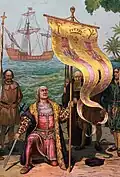 On the left, Christopher Columbus carrying a banner with the initials of Ferdinand II and Isabella I. On the right, an 18th century illustration of Puerto Rico's coat of arms.