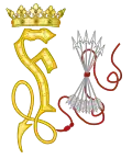 The gold-crowned F and the arrows (Spanish: flechas) represent Ferdinand II of Aragon.