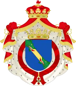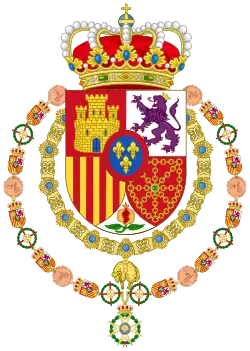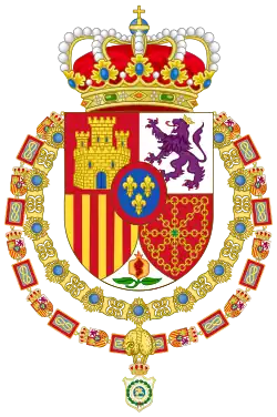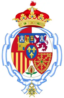 | Shield | Quarterly: Castile, León, Aragon, and Navarre; enté en point: Granada; inescutcheon Bourbon (Anjou Branch) |