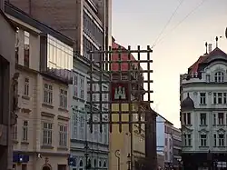 The coat of arms of Bratislava (German: Preßburg, Hungarian: Pozsony), Slovakia, has been used since 1436, when Sigismund of Luxembourg granted the town the right to use its own coat of arms. The coat of arms depicts, on a red late Gothic background, a silver three-towered fortification with a gate in the centre.[1] There are two golden spheres on top of each tower and a golden half-raised portcullis in the gate.