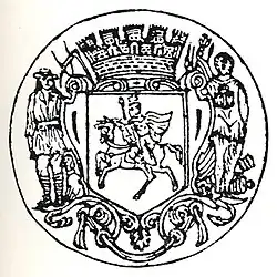 According to Constantin C. Giurescu, Alexandru Ioan Cuza changed the seal to depict the patron saint and an image of the mythical shepherd Bucur.[4] However, it appears that St Dimitrie Basarabov (or St Demetrius) was introduced as a symbol during Cuza's reign (in 1864, as attested by Monitorul Oficial).[2] The arms were enlarged after World War I, when the mural crown and all other present-day elements were added, while the image of Bucur was removed.[4]