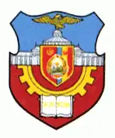The 1970 coat of arms consisted of an escutcheon divided party per fess; chief, landscaped, an eagle, or, wings displayed, facing sinister, over the image of the Palace of the Patriarchate, argent, on an azure field; over a cogwheel, or, with an open book with the lettered motto CIVITAS (verso) and NOSTRA (recto) (reading "Civitas Nostra" (Latin for "Our City"), or, on a field, gules; with an inescutcheon divided party per pale, dexter a hammer and sickle (symbol of the Romanian Communist Party)) on a field, gules, sinister the flag of Romania, the inescutcheon charged with the crest of Communist Romania.[6]