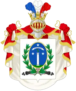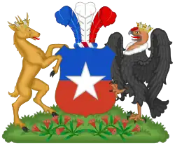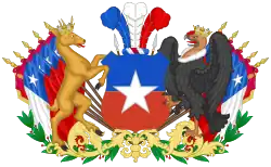 In 1832, Joaquín Prieto commissioned the creation of a permanent coat of arms for the Republic.[3] Charles Chatworthy Wood Taylor, an English artist, was designer of the coat that included a field party per fess, blue and red, with a condor and a huemul for supporters and three feathers with the national colors of Chile, that symbolized the feathers that the President and Supreme Director used on their hats as a symbol of power.