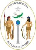 1813—1814 The first arms depicted a doric column with a globe at its top, with a native man and woman as supporters, a wreath, a halbert, a star and the two mottoes in Latin Post tenebras lux and Aut consilio aut ense.