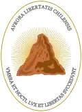 There are no original representations of this first coat of arms, so its design is open to interpretation. One of the few sources is a description made in the Memoria histórica sobre la Revolución de Chile by Melchor Martínez. Although the version with supporters is the most accepted representation of the coat, other historians have suggested that the coat of arms was oval-shaped, and had also a reverse depicting a sun rising behind mountain with the mottoes Aurora libertatis chilensis ("The beginning of Chilean liberty") and Umbra et nocti, lux et libertas succedunt ("Shadow and night are succeeded by light and liberty").[2]