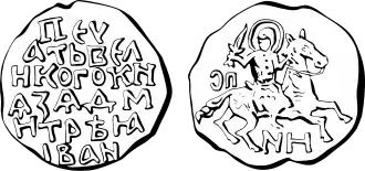 The symbol of the horseman passed down through the generations: from Dmitry to his son Vasily I, then to Vasily II and Ivan III. A coin which featured the image became known as kopeck, from kopyo, the Russian word for "spear".