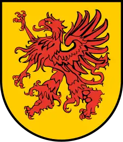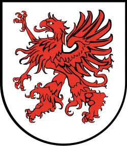 The coat of arms of the West Pomeranian Voivodeship, Poland depicts a red griffin with a yellow (golden) beak and claws standing in the combat position, placed within the white (silver) Iberian style escutcheon.[35] It was designed by Jerzy Bąk, and its design was based on the red griffin present on the banner used by the forces of Casimir V, duke of Pomerania-Stettin, during the Battle of Grunwald in 1410.[34]