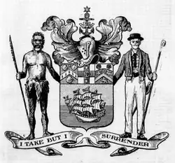 The coat of arms of Sydney was granted to the city on 30 July 1908 by England's College of Arms.[1] It features a three-masted ship on a gold and blue background, along with symbols pertaining to various figures in Sydney's history (namely Viscount Sydney, Governor Phillip, Captain Cook, and Sir Thomas Hughes). The crest is an anchor encircled by a mural crown and surmounted by a six-pointed star, and the supporters are an Aboriginal and an 18th-century British seaman. The motto is "I take but I surrender". An interpretation published alongside the grant of arms explains this as follows: