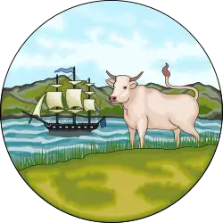 1876–1925 | In 1876 the islands were granted a seal consisting of an image of HMS Hebe (which brought many of the early British settlers to the islands, including Richard Moody, in the 1840s) in Falkland Sound, overlooked by a bullock (representing wild cattle which once roamed the islands).[12] |