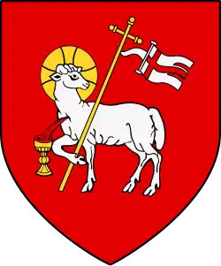 The bottom part of the coat of arms is divided vertically into two fields. The left field features the Lamb of God, in a form of a white (silver) sheep with a yellow (golden) circular aureola with a red cross within it, behind its head. In its front right hove, it holds a yellow (golden) cross with a white (silver) banner with red cross on it, attached to it. It bleeds from its chest, with the red drops of blood falling towards a yellow (golden) chalice placed in front of it, between its legs.[1] It is based on the coat of arms of the historical region of Warmia, more precisely the Prince-Bishopric of Warmia, and the Roman Catholic Archdiocese of Warmia, with the Lamb of God being one of the regional symbols since the 14th century.[5][6]
