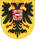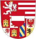 Quarterly, I gules a lion rampant argent, queue fourchée crossed in saltire, armed, langued, and crowned Or (for Bohemia); II barry of eight, gules and argent (for Hungary); III grand-quarterly, i and iv gules a three-towered castle Or (for Castile), ii and iii argent a lion rampant purpure armed, langued, and crowned Or (for Leon); IV per pale, dexter bendy of six Or and azure a bordure gules (for Burgundy), sinister per fess, chief argent an eagle displayed gules armed, langued, and beaked Or (for Tyrol), and base Or a lion rampant sable, armed and langued gules (for Flanders); overall an inescutcheon gules a fess argent (for Austria). |