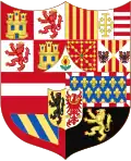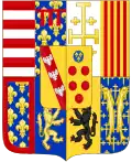 Quarterly, I gules a three-towered castle Or masoned sable and ajouré azure (for Castile); II barry of eight, gules and argent (for Hungary); III per pale, dexter Or four pallets gules (for Aragon), sinister per saltire i and iv Or four pallets gules, ii and iii argent an eagle displayed sable (for Sicily); IV per pale, dexter gules a fess argent (for Austria), sinister bendy of six Or and azure a bordure gules (for Burgundy); overall an inescutcheon gules a lion rampant argent, queue fourchée crossed in saltire, armed, langued, and crowned Or (for Bohemia). |