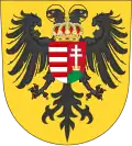 Quarterly, I barry of eight, gules and argent (for Hungary); II gules a lion rampant argent, queue fourchée crossed in saltire, armed, langued, and crowned Or (for Bohemia); III per pale, dexter gules a fess argent (for Austria), sinister bendy of six Or and azure, a bordure gules (for Burgundy); IV grand-quarterly i and iv gules a three-towered castle Or ajouré azure (for Castile), ii and iii argent a lion rampant purpure armed, langued, and crowned Or (for Leon). |