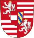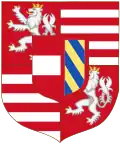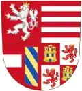 Quarterly, I and IV gules a lion rampant argent, queue fourchée crossed in saltire, armed, langued, and crowned Or (for Bohemia); II and III barry of eight, gules and argent (for Hungary); overall and inescutcheon per pale, dexter gules a fess argent (for Austria), sinister bendy of six Or and azure, a bordure gules (for Burgundy). |