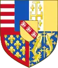 Quarterly, I barry of eight gules and argent (for Hungary) impaling azure semy-de-lis Or a label gules (for Naples); II argent a cross potent and four crosslets Or (for Jerusalem) impaling Or four pallets gules (for Aragon); III azure semy-de-lis Or a bordure gules (for the House of Valois-Anjou) impaling azure a lion sinister rampant Or, armed, langued, and crowned gules (for Guelders); IV Or a lion rampant sable, armed and langued gules (for Jülich) impaling azure crusilly fitchy, two barbels haurient addorsed Or (for Bar); overall an inescutcheon Or a bend gules three alerions argent (for Lorraine) impaling Or, in annulo six torteaux, the torteau in chief replaced by a roundel azure charged with three fleurs-de-lis Or (for the Medici family). |