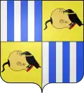 Quarterly: paley Azure and Argent; and Or, a raven collared Or pecking the eye out of a Turk's head couped at the neck Proper. |