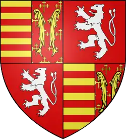 Quarterly: Argent, two sceptres in saltire, tipped with fleurs-de-lys Azure, surmounted by a tower Gules ajouré Azure; Or a lion Gules, crowned, armed and langued Azure; overall an inescutcheon Azure, a badger Proper. |