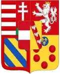 Per pale, dexter barry of eight, gules and argent (for Hungary); sinister gules a lion rampant argent, queue fourchée crossed in saltire, armed, langued, and crowned Or (for Bohemia). |