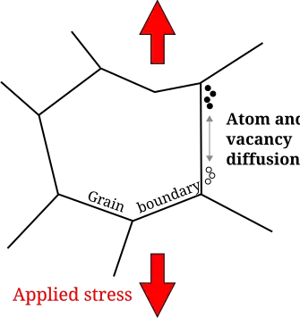 Coble creep and Nabarro–Herring creep are closely related mechanisms. They are both diffusion processes, driven by the same concentration gradient of vacancies, occur in high temperature, low stress environments and their derivations are similar.[1] For both mechanisms, the strain rate is linearly proportional to the applied stress and there is an exponential temperature dependence. The difference is that for Coble creep, mass transport occurs along grain boundaries, whereas for Nabarro–Herring the diffusion occurs through the crystal. Because of this, Nabarro–Herring creep does not have a dependence on grain boundary thickness, and has a weaker dependence on grain size . In Nabarro–Herring creep, the strain rate is proportional to as opposed to the dependence for Coble creep. When considering the net diffusional creep rate, the sum of both diffusional rates is vital as they work in a parallel processes.