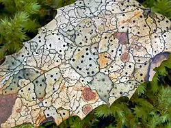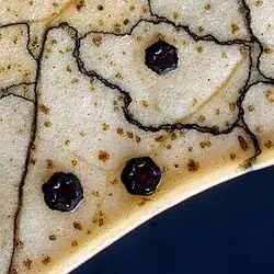 The apothecia of Coccomyces dentatus are distributed in bleached spots that are bounded by a black lines inside the outer cell layer of the leaf (intraepidermal).[7] The black lines—often referred to as zone lines—are the result of an antagonistic interactions between individuals of different genotypes that colonize the leaf surface.[14] Apothecia are usually accompanied by pycnidia (asexual fruit bodies) measuring 0.5–1.0 mm in diameter. The apothecia are black, and shiny, with four to six sides. They have a star-shaped pattern of grooves formed by lighter colored cells. When the spores are mature, these open (dehisce) by triangular "teeth" to expose the dull yellow hymenium (spore-bearing surface).[7]