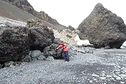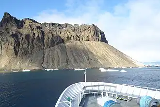 Geologically, the area makes up the Cockburn Island Formation, which was studied extensively in the late 1990s by H. A. Jonkers.[1] Rocks found on the island are volcanic,[2] and the island is characterized by its "precipitous cliffs".[3] A "Pecten conglomerate" from the late Pliocene or early Pleistocene period has been identified on the island, situated on a wave-cut platform at 720–820 ft.[4] The island is a rare volcano type called a tuya, or moberg, which was formed by a three-stage eruption sequence below an ice cap. The first stage was a subglacial hyaloclastic eruption under a thick ice cap, which shattered the lava into glass, ash and sand, which has since weathered to yellow palagonite layers. The second phase was a lava eruption into a meltwater glacial lake contained in the ice cap, which resulted in volcanic breccia and basalt pillow lava (boulders of this can be seen along the shore). The final phase was subaerial basalt lava flows on top of the previous volcanic deposits after the lake drained or boiled away.