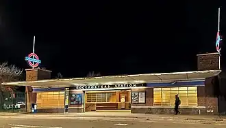 The station was designed by Charles Holden in a modern European style using brick, glass and reinforced concrete.[9] Compared with the other new stations Holden designed for the extension, Cockfosters' street buildings are modest in scale, lacking the mass of Oakwood or Arnos Grove or the avant-garde flourish of Southgate. Holden's early design sketches show the station with two towers.[10] The most striking feature of the station is the tall concrete and glass trainshed roof and platform canopies, which are supported by portal frames of narrow blade-like concrete columns and beams rising from the platforms and spanning across the tracks. The trainshed roof constructed at Uxbridge from 1937 to 1938 was built to a similar design. Cockfosters station is a Grade II listed building.[7]