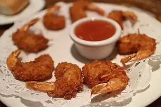 Crunchy coconut shrimp is typically prepared using shrimp that are coated with flour, placed in an egg wash, coated with a flaked coconut and bread crumb mix, and then deep-fried.[1][2] The shrimp can be butterflied prior to being coated.[3] Panko bread crumbs or standard bread crumbs can be used, as can a mixture of both.[2][4][5] Chopped nuts such as macadamia and almond can be used as additional ingredients to coat the shrimp.[6]