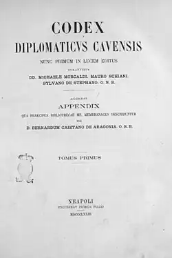The Codex diplomaticus cavensis (CDC bibliographic abbreviation; in Italian: the diplomatic code of the Cavense, or Cavese) is an editorial project active in the field of the history of medieval Italy and Langobardia Minor, which began in 1873 and continued with an irregular trend. The project pursues the objective of exhaustive publication of the entire diplomatic and documentary corpus kept in the archive of the Benedictine Abbey of the Holy Trinity, located in Cava de 'Tirreni. The consistency of the archive spans over 15,000 parchments, starting with the first writing that dates back to 792. To this membranous patrimony there is to be added a substantial amount of documents on paper.[1]
