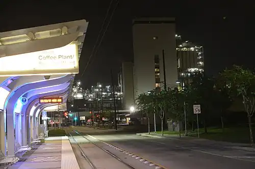 Coffee Plant/Second Ward is a light rail station in Houston, Texas on the METRORail system. It is served by the Green Line and is located on Harrisburg Boulevard between York and Hutcheson streets. The station is named for the Second Ward neighborhood as well as a former Maxwell House coffee manufacturing plant. Maxwell House began operations at the plant in 1948 and sold the plant to Maximus Coffee Group in 2006,[1] which operated the plant under the Atlantic Coffee Solutions brand until 2018.[2]