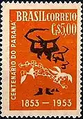 A commemorative stamp was issued in Brazil to mark the 50th anniversary of Japanese immigration. It depicts rice and coffee trees above and below agricultural implements. (1958) -