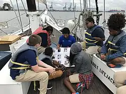 A student cohort aboard a ship on the Star-Spangled National Historic Trail learning about the War of 1812