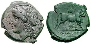 The coinage of Cales concerns coins minted in Cales, a city in Campania, the most important urban center of the ancient Italic population of the Ausones.[1] Cales was located on the Via Latina, halfway between the mountains of Samnium and the plains of Campania felix, a few kilometers north of Casilinum (present-day Capua) and just south of Teanum Sidicinum.