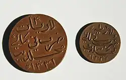 In 1318 AH (1900), a copper larin (or laari) was struck. In 1319 AH (1901), a copper laari was also struck. In 1320 AH (1902), a copper laari and a 4 laari was struck.